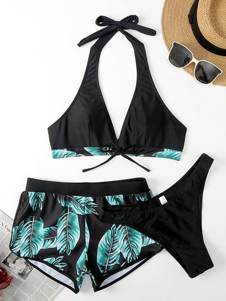 送料無料 2022セクシーリーフプリントスリーピースビキニセットホルタープッシュアップ水着女性水着ブラジルビキニ入浴者水着 AE36655550388567298