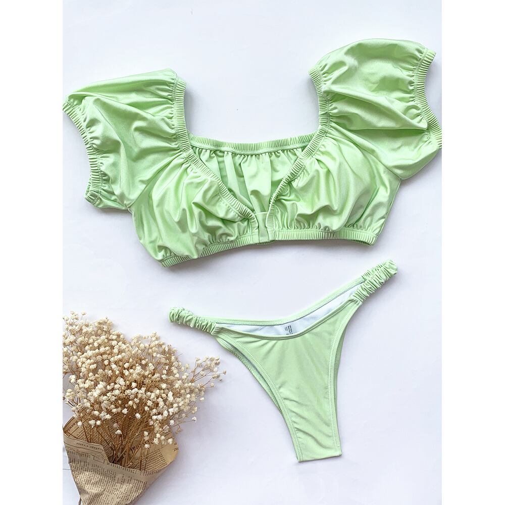 送料無料 明るい生地のパフスリーブビキニ2021セクシーなVネック水着女性水着2ピースビキニセット入浴水着水泳 AE36655541314314061