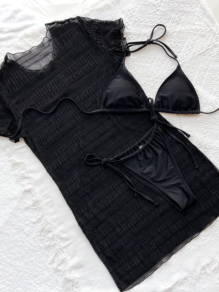 送料無料 2022年セクシーなスリーピースビキニセットメッシュ透明ビーチドレス女性水着水着ソリッド水着ビーチウェア ソリッドカラー AE36655535750382692