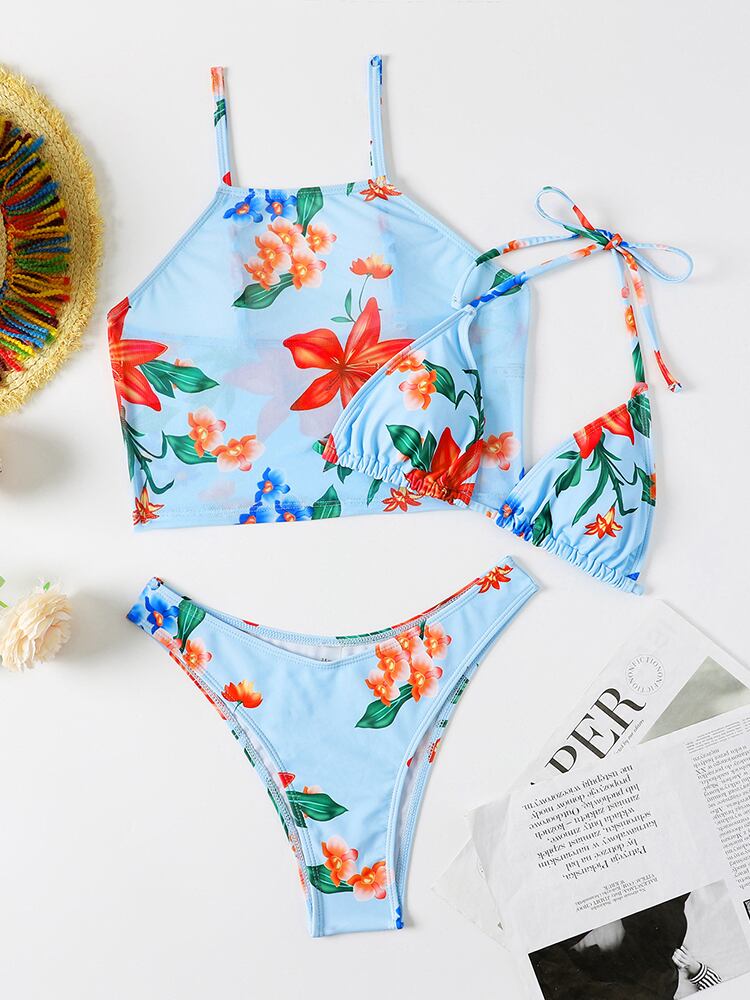 送料無料 2022フローラルプリントスリーピースビキニセットネック水着レディース水着セクシーホルタービキニ水着ビーチウェア 花柄 AE3665552865106593