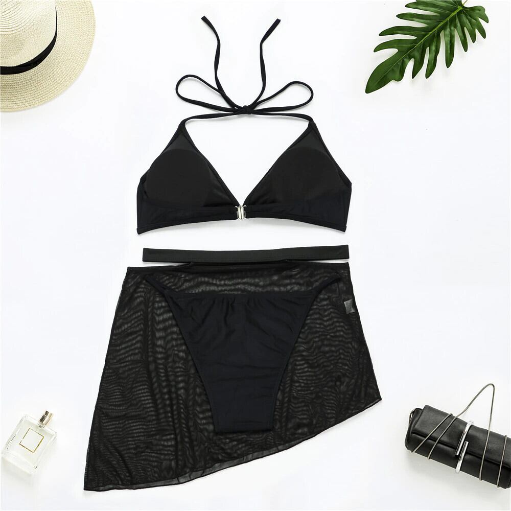 送料無料 2021年セクシーなソリッドスリーピースビキニセットビーチスカート水着ホルターストラップ付きビキニ入浴者水着水泳 ソリッドカラー AE36655564000711313
