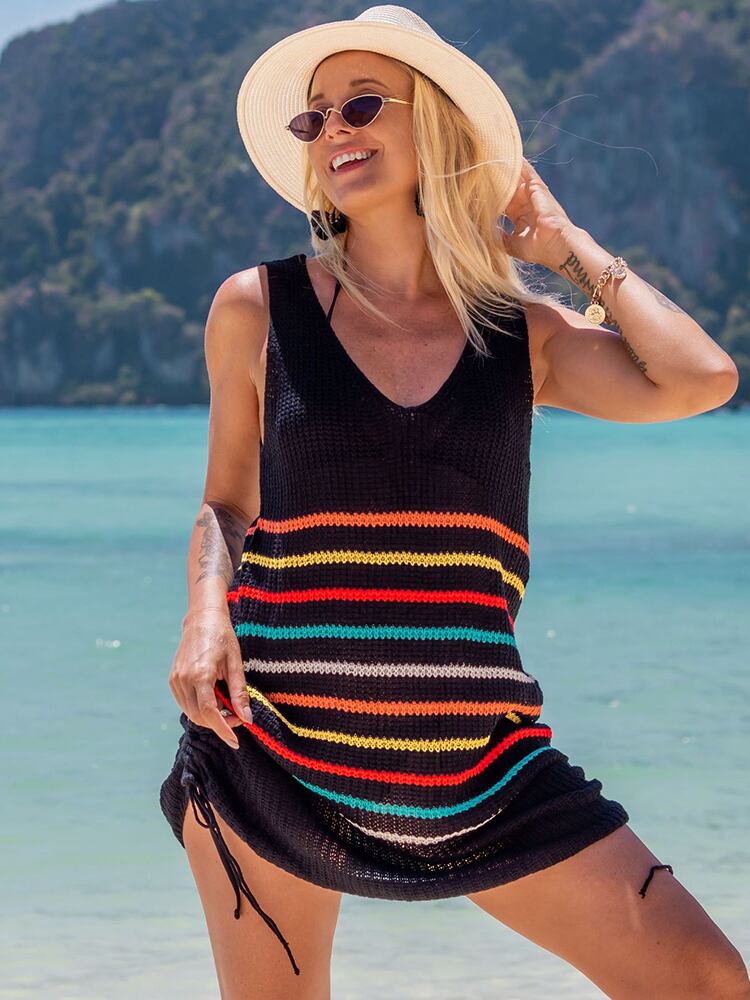 送料無料 2022セクシーなニットビーチカバーアップ女性ビキニカバーアップ女性ビーチドレスストライププリントスカート水着カバーアップバックレスローブ AE36655570919325324