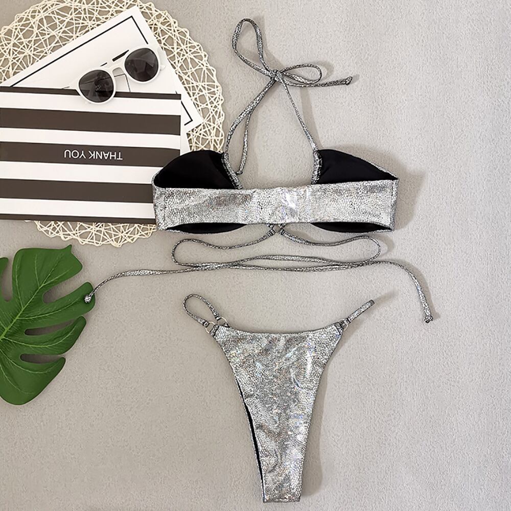 送料無料 セクシーなビキニ 2023 水着ローウエストの女性シルバー金色の生地スネークパターン水着ビキニホルターレースアップ水着 銀 AE121233222121159150219111