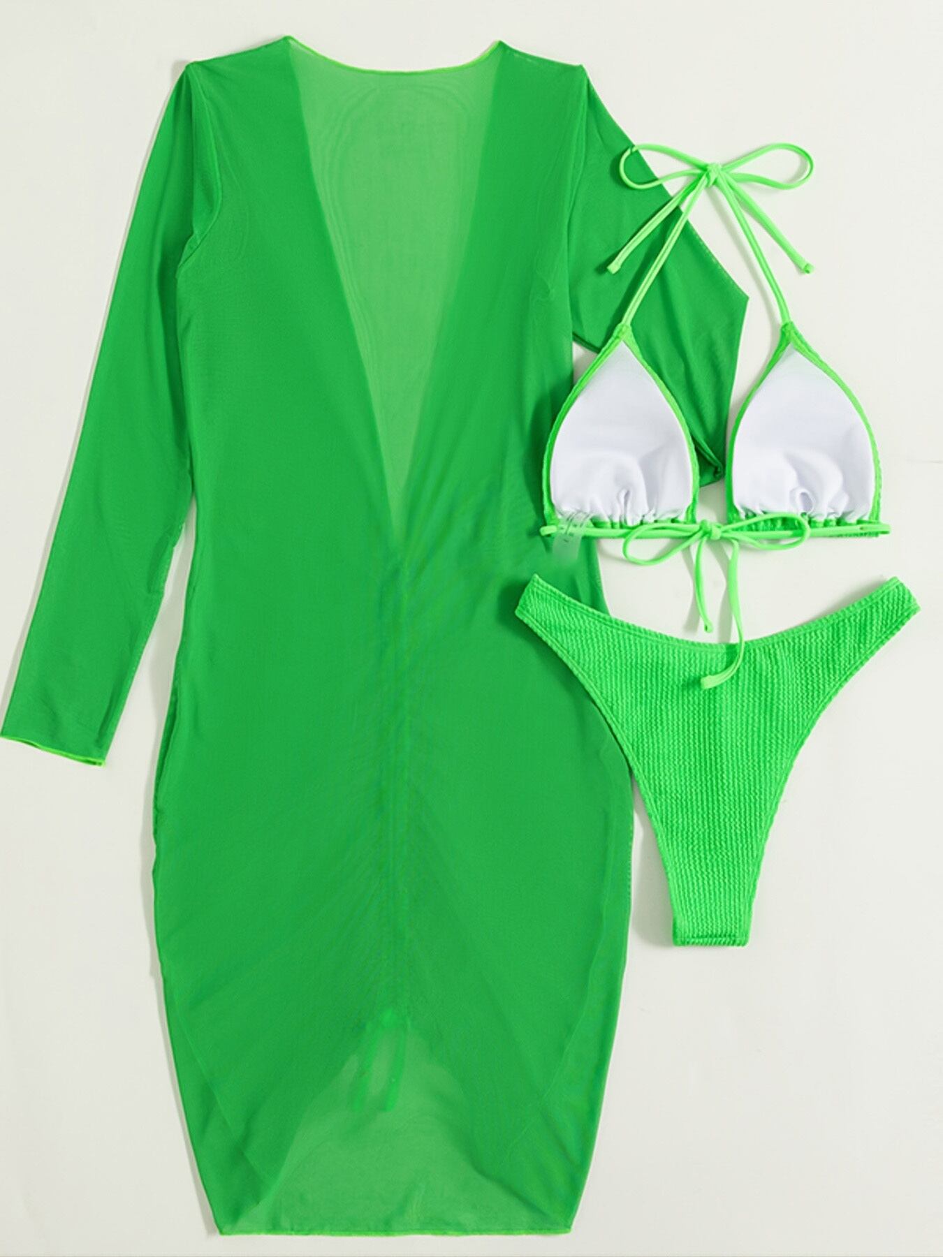 送料無料 3 ピースグリーン三角形ホルタービキニ水着長袖カバーアップ水着女性 2023 海水浴者水着水着 ロング AE121255572079304749