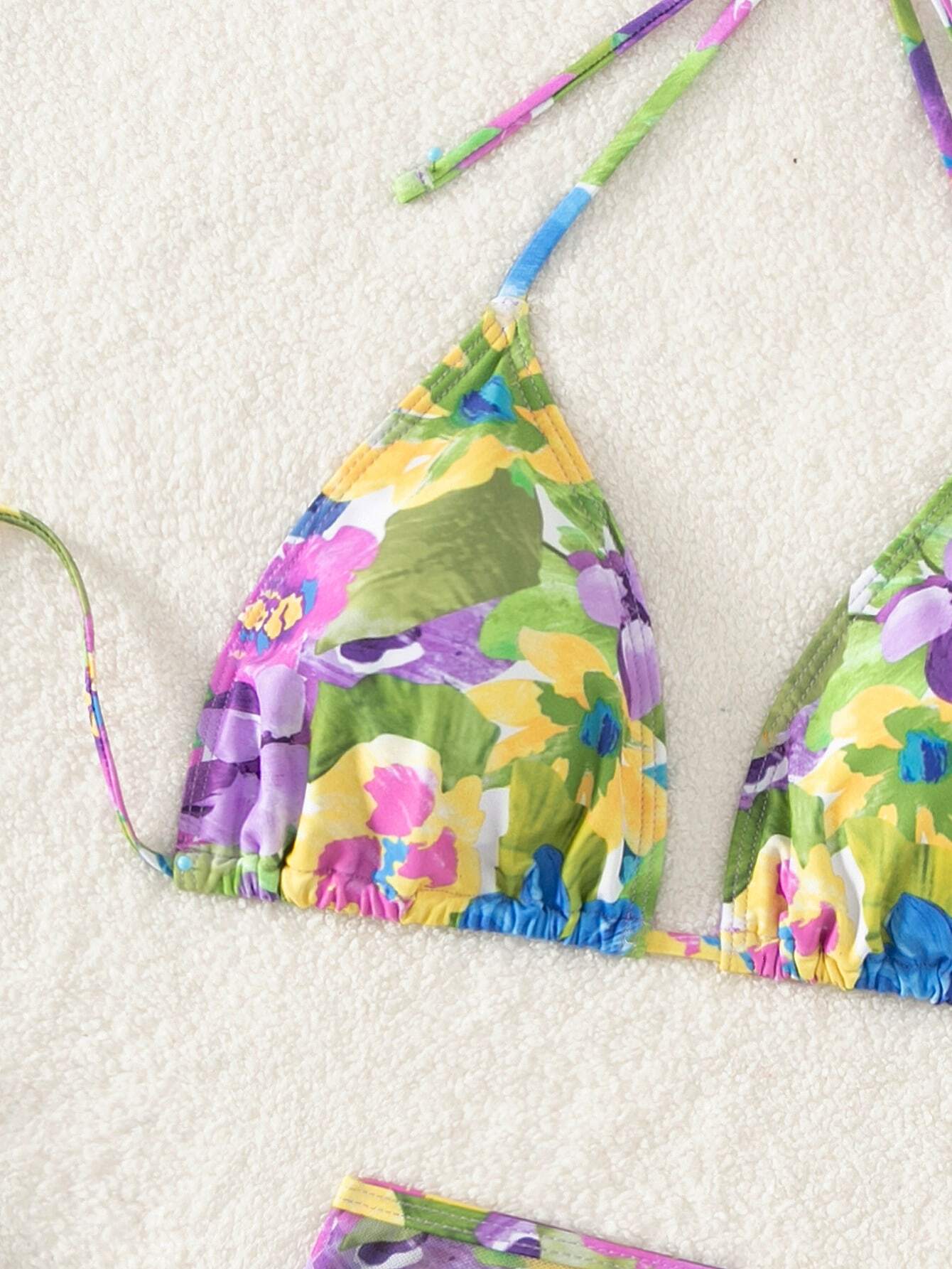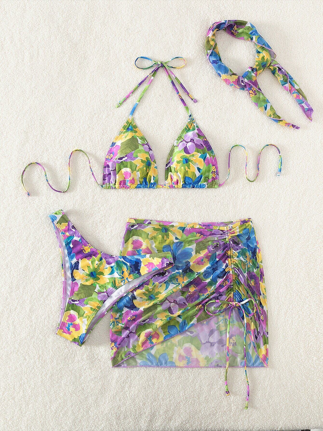 送料無料 4 個花ホルター三角ビキニ 2023 ビーチスカート & バンダナ水着女性水着海水浴客水着水泳 花柄 AE121255538455617810
