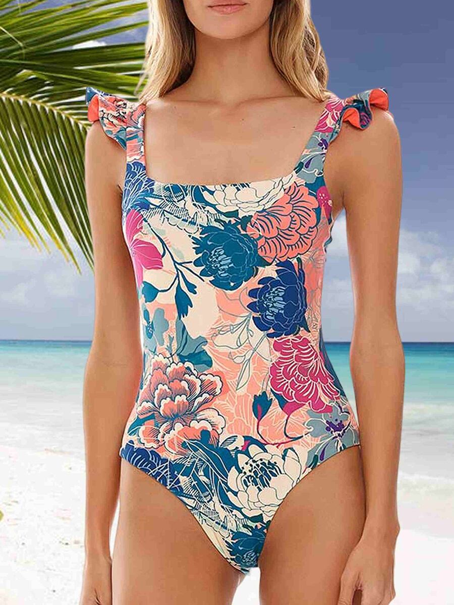 送料無料 2023 花柄プリント水着女性ワンピースパッド入り水着フリルボディスーツ水着海水浴者ビーチウェア AE121255512039477937
