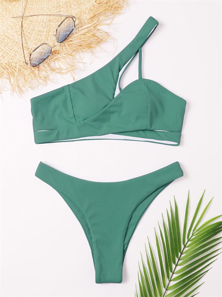 送料無料 ビキニセクシーな Tバック水着 2023 固体リブビキニセットワンショルダー水着女性の夏のビーチウェア水着 サマー 夏物 ソリッドカラー AE12127767528660628539