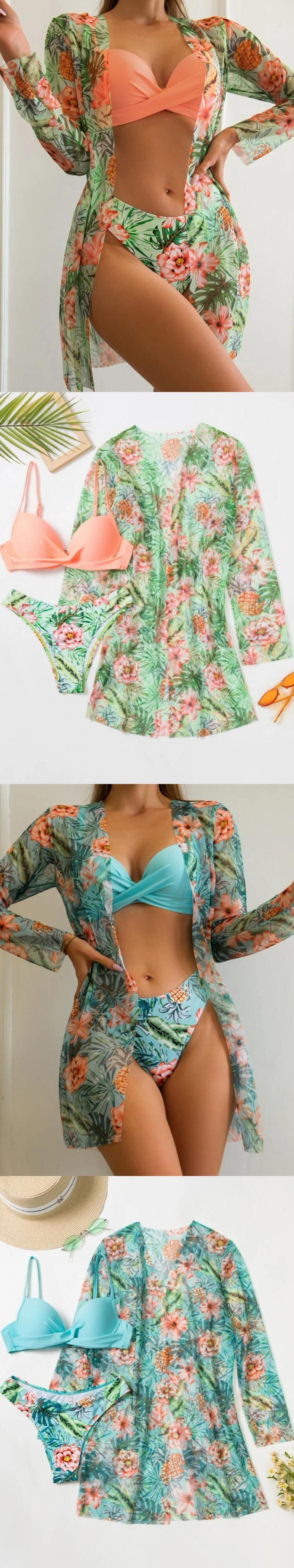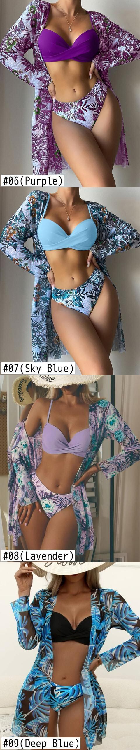 送料無料 ビキニセクシーな女性水着 2023 プリント 3 ピースビキニセット Tバック水着長袖ビーチカバーアップ水着 ロング AE12127767511408432889
