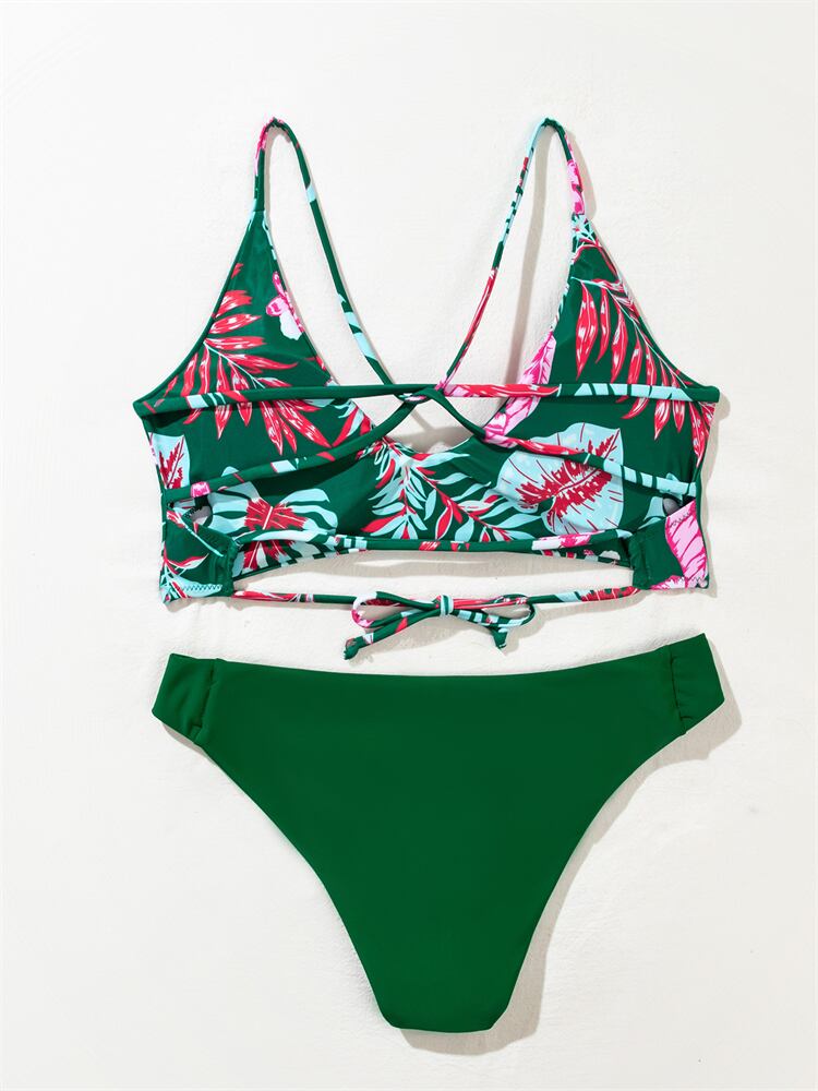 送料無料 ビキニセクシーな女性水着 2023 グリーンプリントスリングビキニセット Tバック水着背中の開いた夏のビーチウェア水着 サマー 夏物 AE12127767535456786007