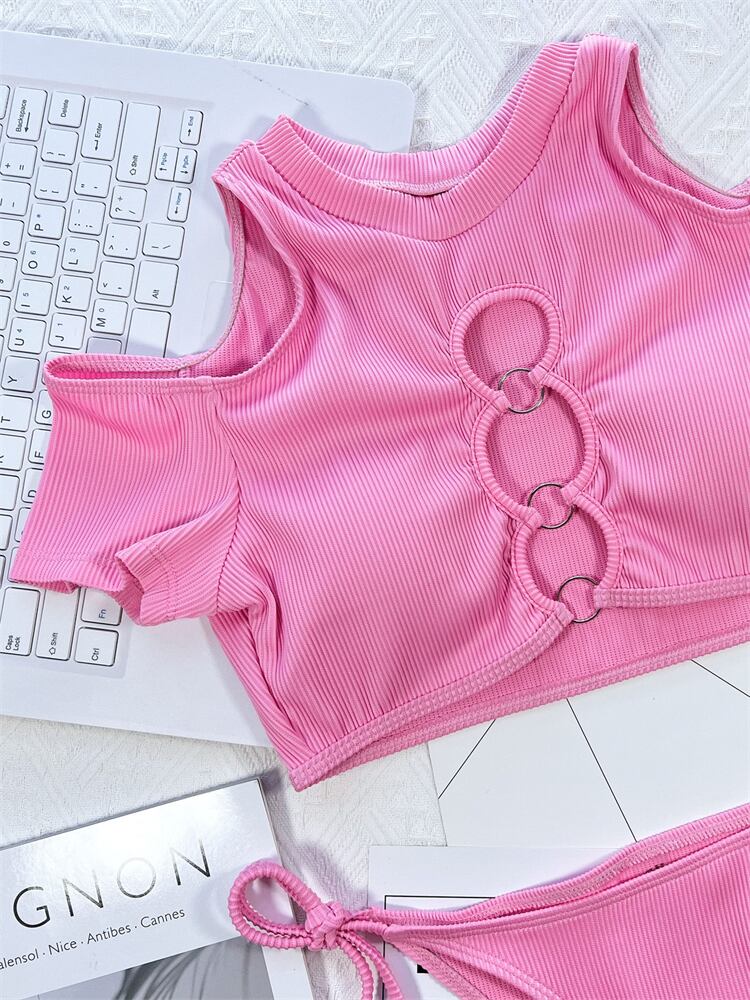 送料無料 ビキニセクシーな水着女性水着 2023 ピンク半袖ビキニセットリブ中空アウト夏のビーチ水着 ショート ハーフスリーブ サマー 夏物 AE12127767548030211372