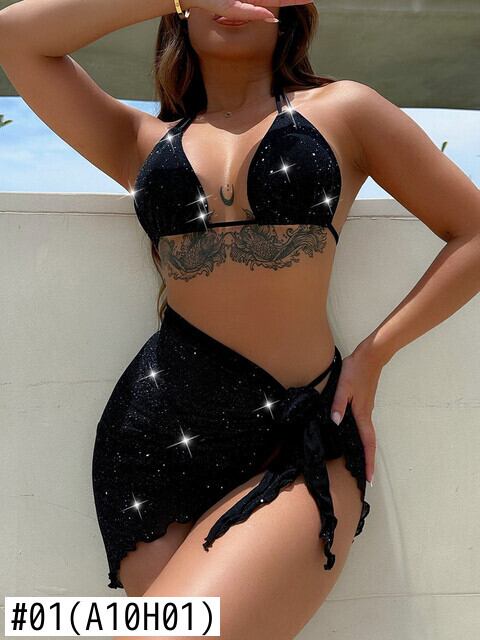 送料無料 セクシーなビキニ 3 個女性水着 2023 黒カバーアップ水着マイクロビキニセット光沢のある Biquini 水着ビーチウェア ブラック AE1212556557061423483