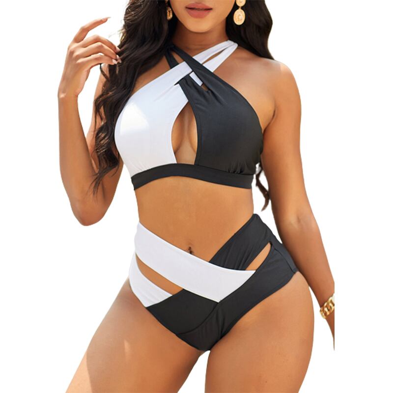 送料無料 セクシーな女性のラップクリスクロスビキニセットカットアウトウエストツーピース水着カラーブロックバック調節可能なストラップ水着 アジャスタブル AE166565637226865075