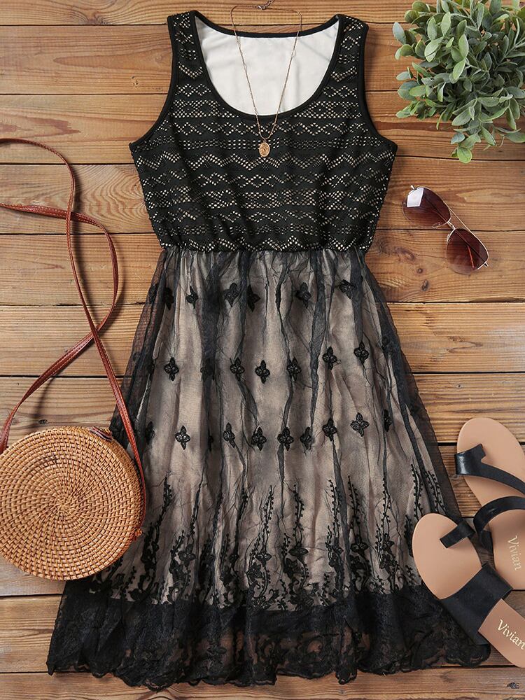 送料無料 女性のレーススカート幾何学プリントパッチワークサンドレス夏ノースリーブブラックヴィンテージレースガーゼミニドレス 2023 サマー 夏物 ビンテージ AE166565687530000795