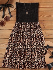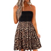 送料無料 女性のヒョウパッチワークスモックフリルストラップレスミニドレス 2023 夏プリーツふわふわスケーターミニチューブドレスビーチパーティー サマー 夏物 AE166565643766831861