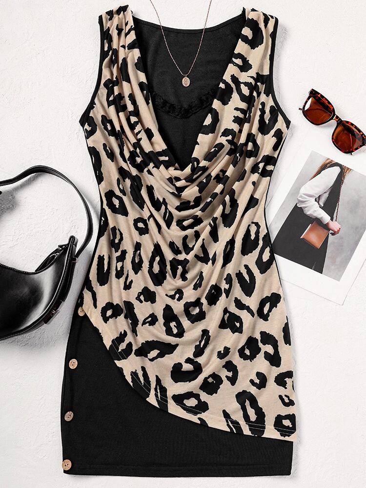送料無料 2023 夏最新ヒョウレーススプライシングカウルネックフェイクツーピースミニドレスサマードレスパーティー 夏物 AE166565693821463273