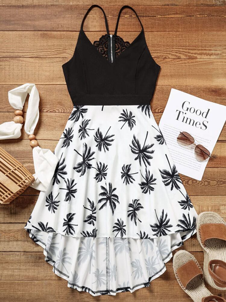 送料無料 女性のセクシーなレーススプライシング背中の開いたスパゲッティストラップミニドレスかわいいココナッツツリー夏のビーチノースリーブ非対称キャミドレス 大人ガーリー スウィート キュート カジュアル サマー 夏物 AE166565687529269122