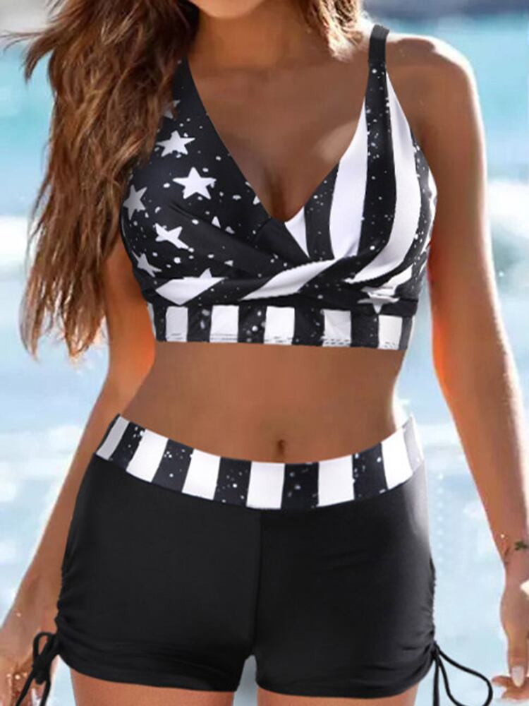 送料無料 レディース アメリカ国旗 巾着 シャーリング ビキニ セット 2 ピース 水着 ウエスト水着 ボーイ ショーツ付き ビーチ 水着 ブルマー AE166565694846650069
