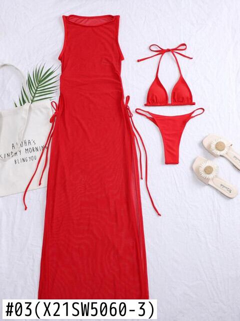 送料無料 メッシュ ビキニ 3 点セット カバーアップ付き - ネック レディース 水着 セクシー カットアウト ノット サイド スプリット 太もも ドレス ビーチウェア 水着 AE332320087897585161315