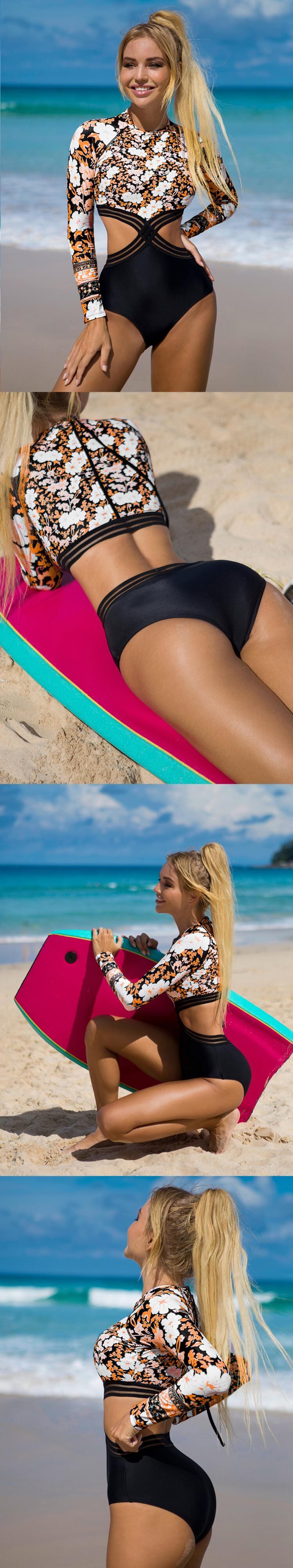 送料無料 Peachtan ヴィンテージプリント水着 2023 女性ワンピース長袖水着ネック女性の水着中空アウトモノキニ ロング ビンテージ AE332320087888938789915