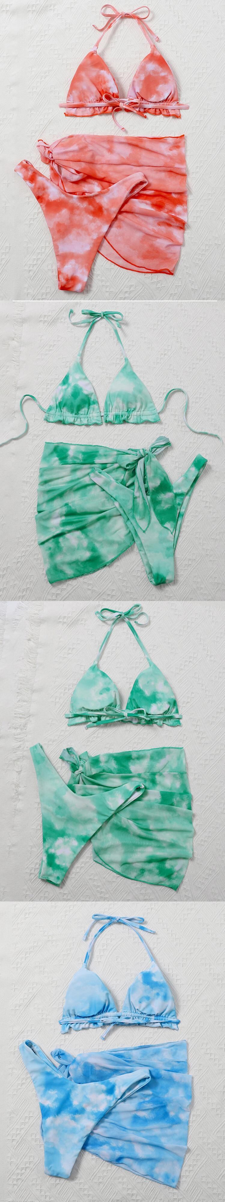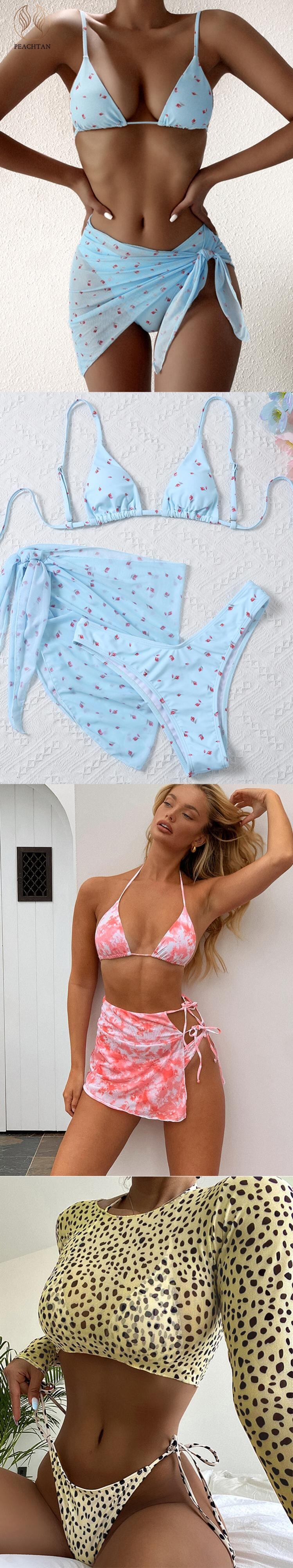 送料無料 Peachtan メッシュ 3 ピースビキニセットプリント女性の水着 Traingle ホルター水着プッシュアップローウエスト水着 2023 女性 AE33232008781392533643