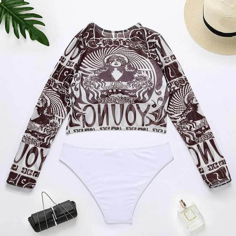 送料無料 Peachtan ネック水着女性長袖水着女性メッシュプリントビキニ 2021 スポーツ水着 2 ピーススーツ biquini ロング AE332320087848601524786