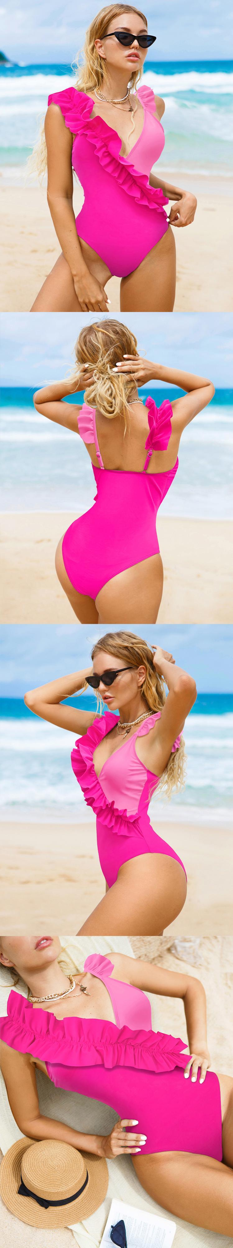 送料無料 Peachtan ソリッドパッチワークフリルモノキニ水着女性 2023 セクシーなカット水着ワンピースプッシュアップウエスト水着 ソリッドカラー AE332320087876450255621