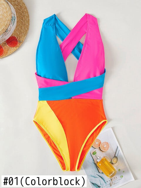 送料無料 2023 カラーブロック十字ネクタイバックレスプランジネックワンピース水着水着ビーチウェア入浴水泳水着 AE121255563663508957