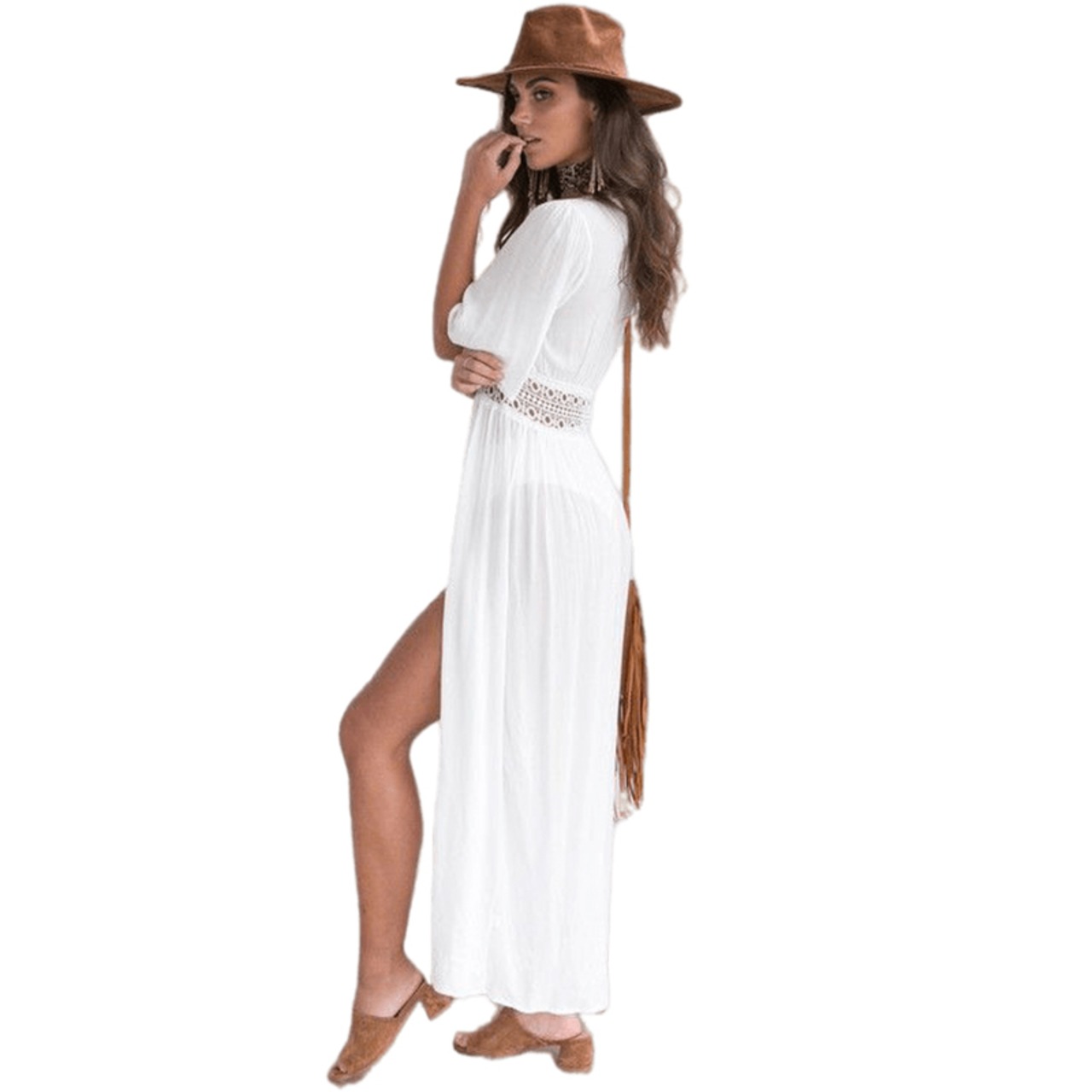 送料無料 ビーチロングマキシドレス女性ビーチカバーアップお出かけチュニックパレオ白 V ネックドレスローブ水着 2022 ビーチウェア ホワイト Vネック AE1212332271876998434