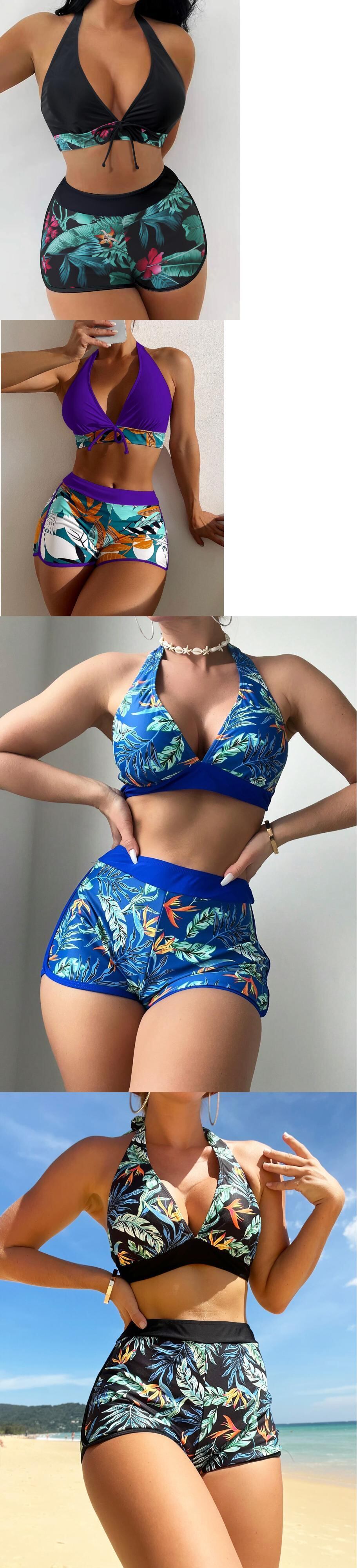 送料無料 2023 ホルタービキニセットショート水着女性ウエスト水着プリント海水浴者水泳水着ビーチウェア AE1212332225802715655