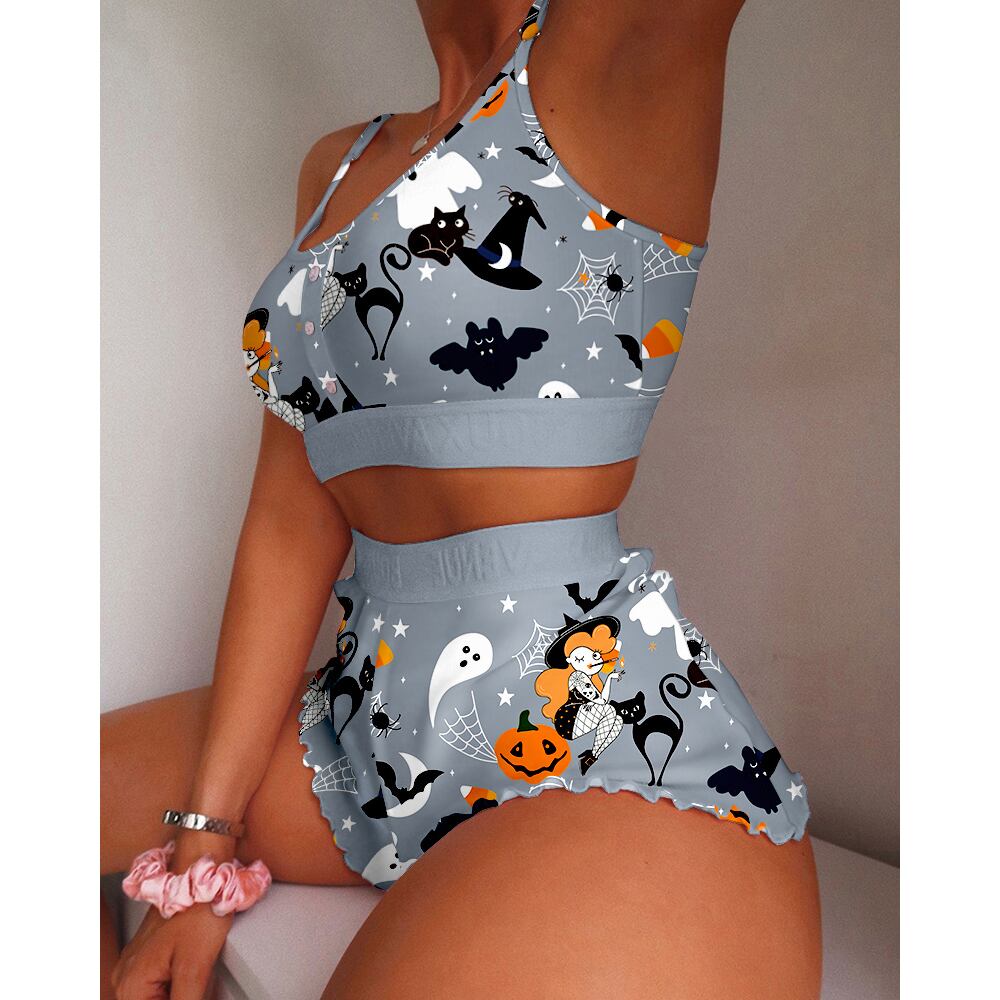 送料無料 女性グラフィックプリントレタストリムキャミセット秋冬ノースリーブクロップトップスツーピーススーツホームウェアショーツスーツ オータム 秋物 ウィンター 冬物 ブルマー AE1212332294619535254