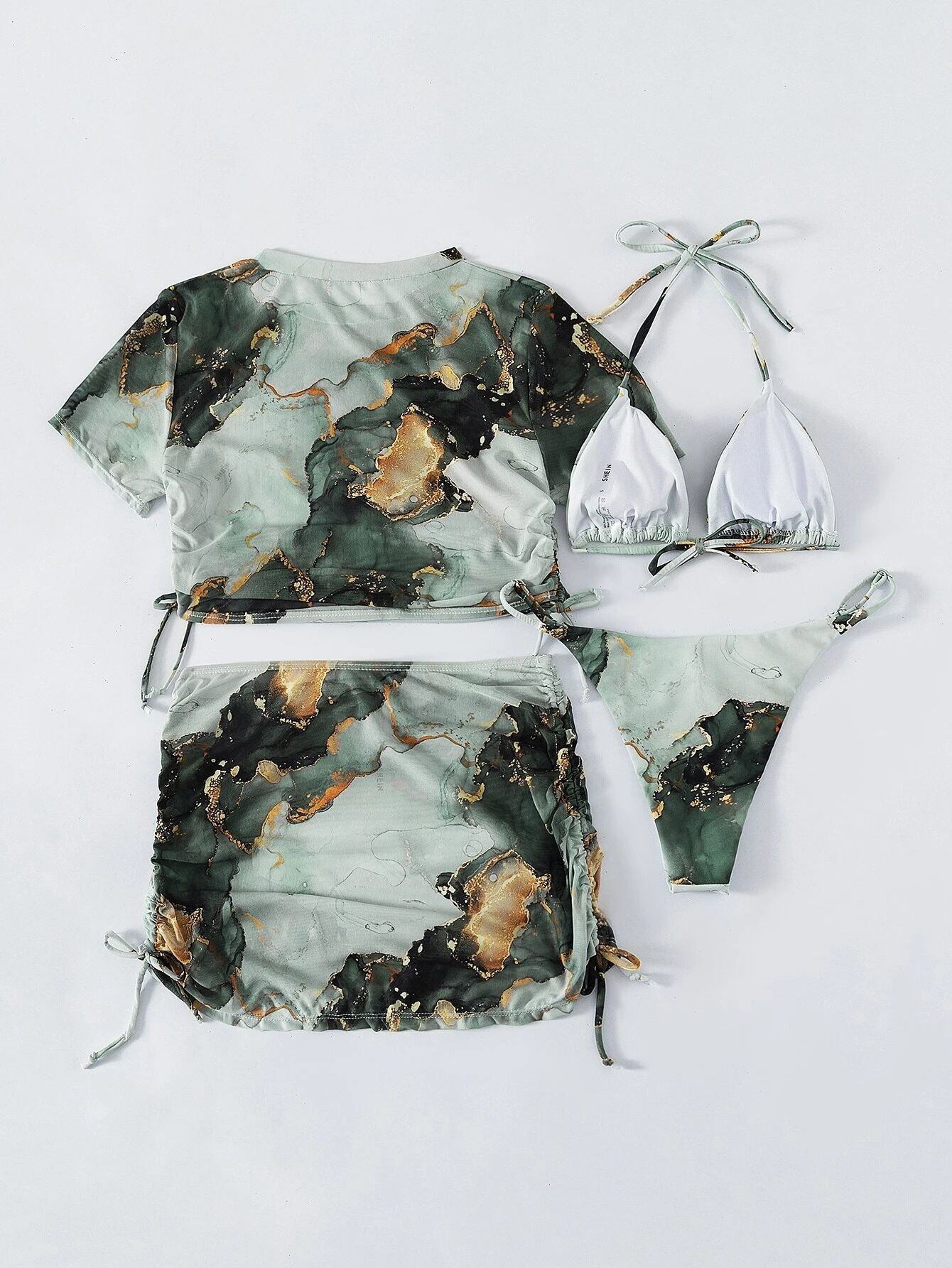 送料無料 4 個ホルタービキニセット女性水着大理石プリントカバーアップセクシーな夏のビーチ水着ビキニ水着 サマー 夏物 AE1212332234833663157