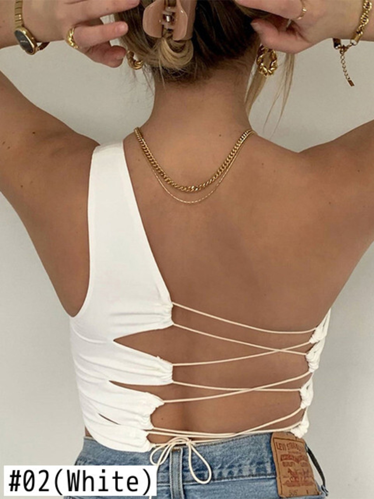 送料無料 セクシーな中空背中の開いた白黒タンクトップ女性サマークラブパーティー着用キャミソールクロップトップススリムソフトベスト Tシャツ ホワイト ブラック 夏物 AE1212332275156686751