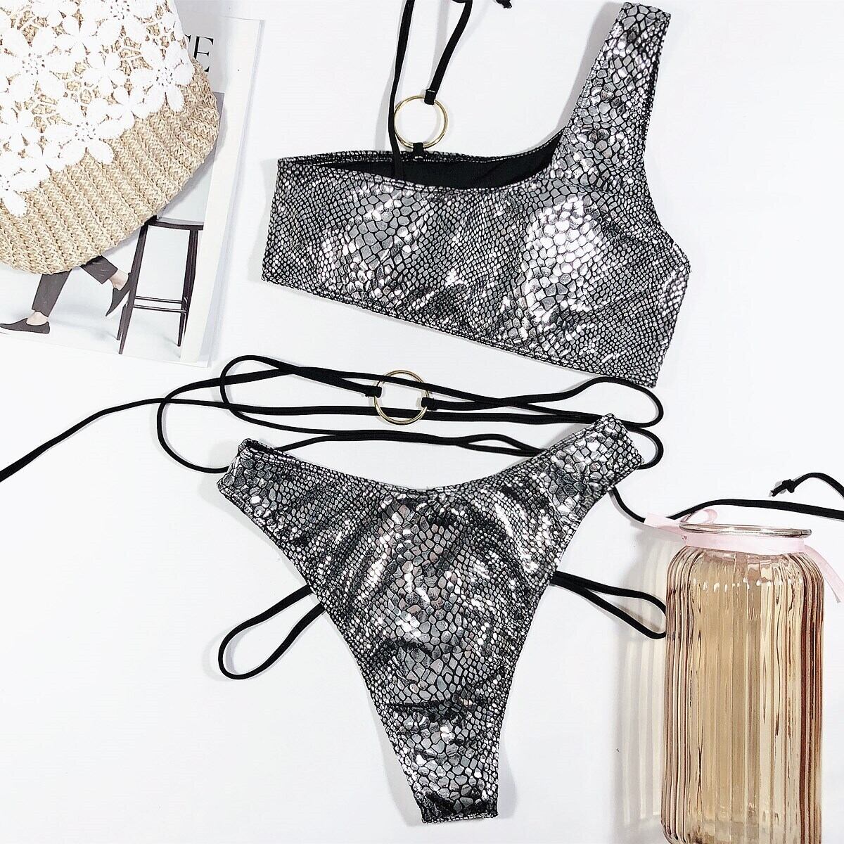 送料無料 セクシーなビキニ女性シルバーブロンズヘビスキンプリント水着水着包帯ビキニセット水着ビキニプッシュアップ 銀 AE1212332276097436469