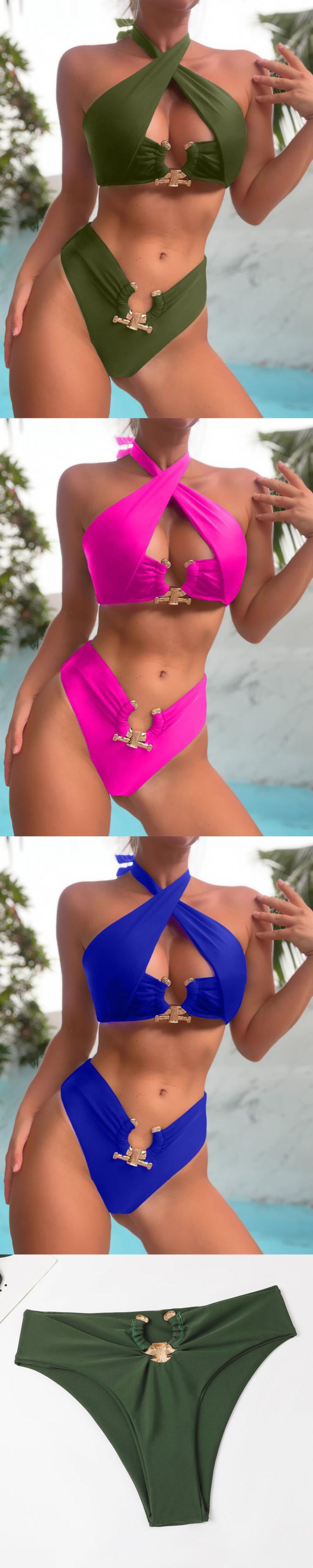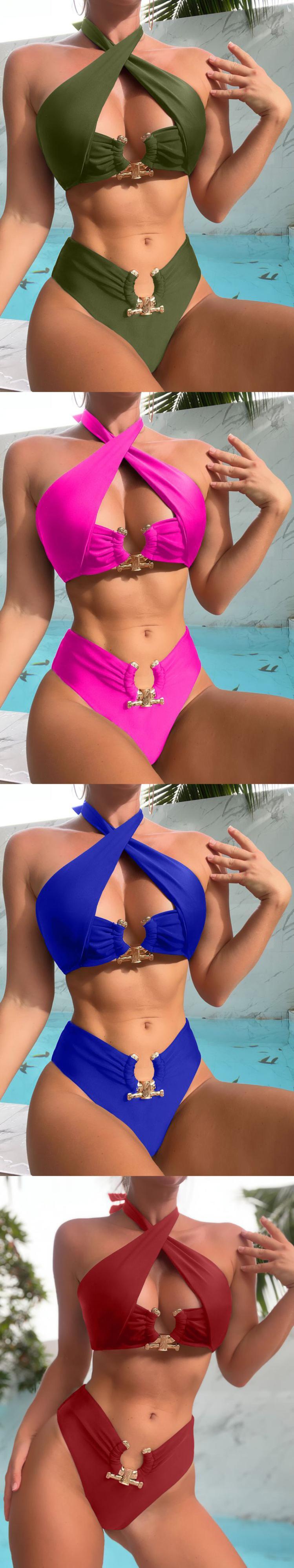 送料無料 2023 女性固体二枚水着セクシーなホルター背中の開いたビキニセットビーチ水着水着 Tバック Biquini ソリッドカラー AE1212332293548886772