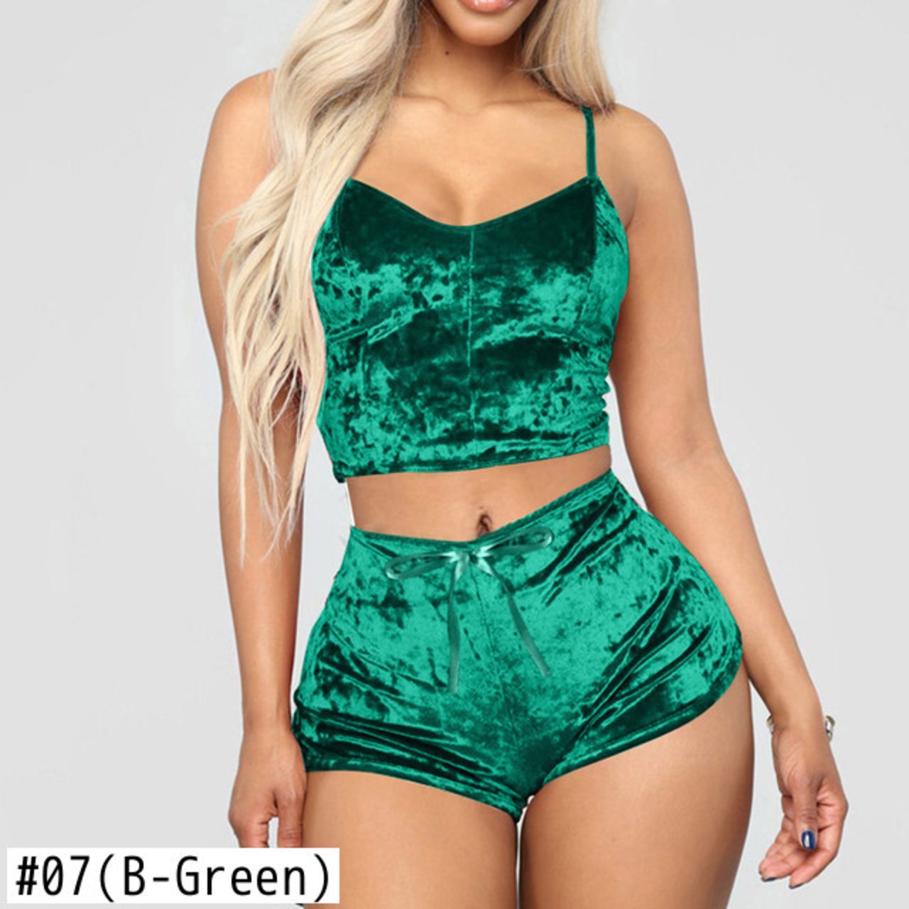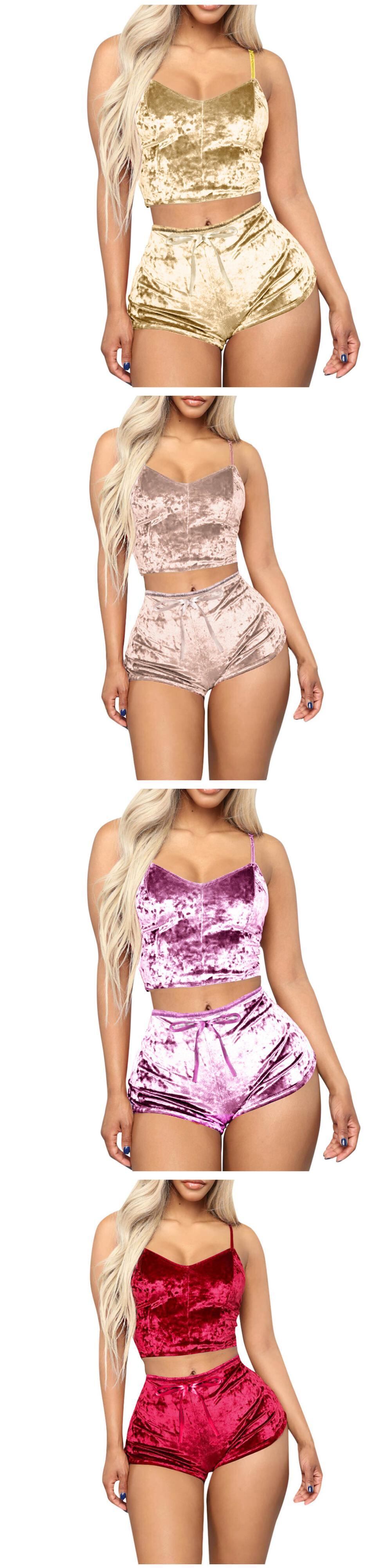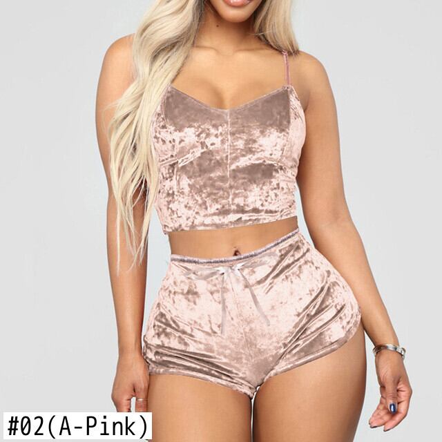 送料無料 女性 2 点セットベルベットパジャマセクシーなスパゲッティストラップショーツパジャマスーツパーティーセットプルオーバー弾性ウエストフル エラスティック 伸縮 ブルマー AE1212332281473643503
