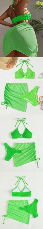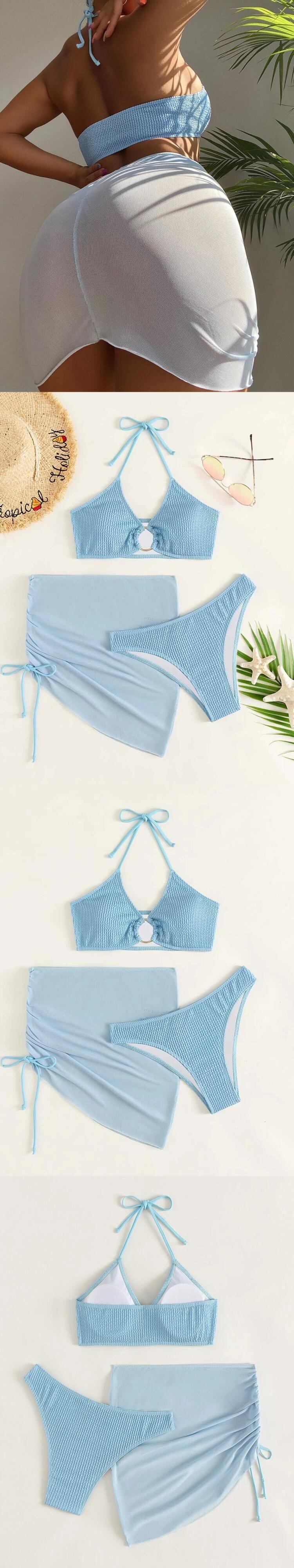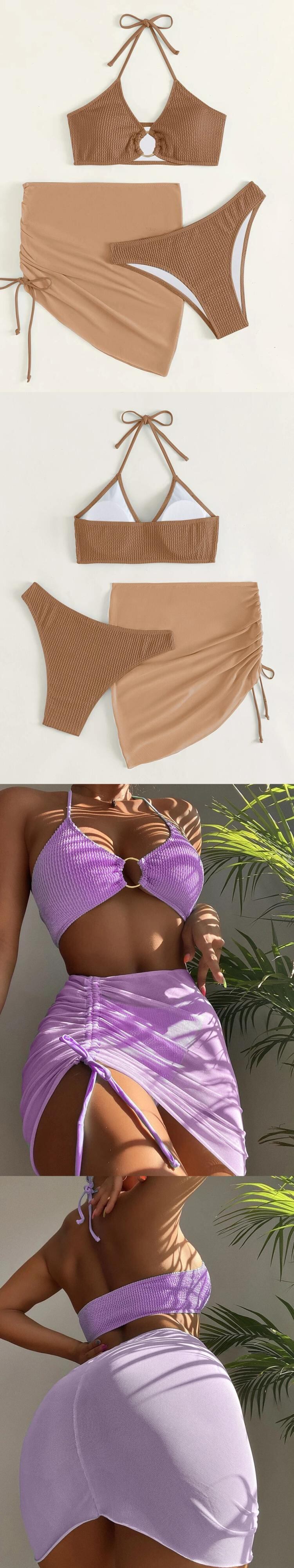 送料無料 テクスチャードリングリンクホルタービキニマイクロリブビキニ2023ウエスト水着ビーチ3ピース分割メッシュスカート水着 レッド 指輪 AE1212332217150344023