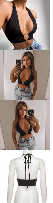送料無料 レディースセクシーなノースリーブリングリンクベストホルターショートタンクトップ背中の開いたリング接続スリムフィットベストスタイルトップススリムトップス 指輪 AE1212332298760399147