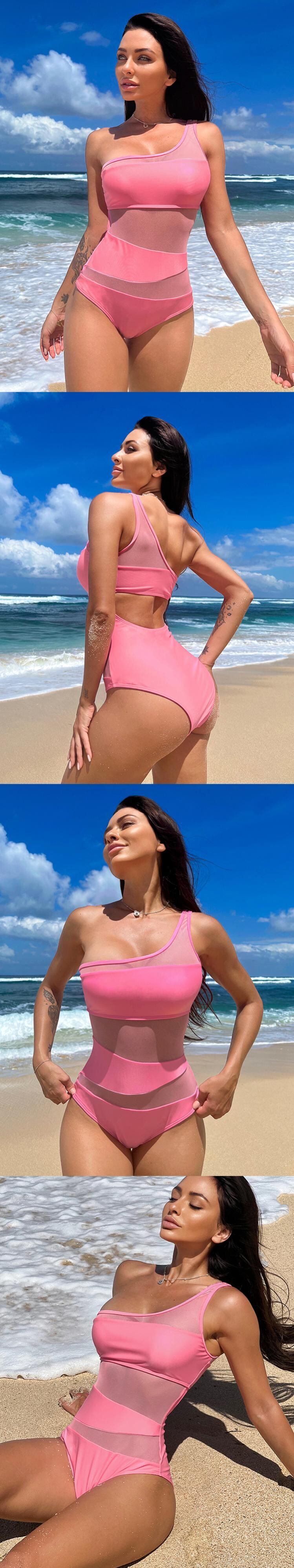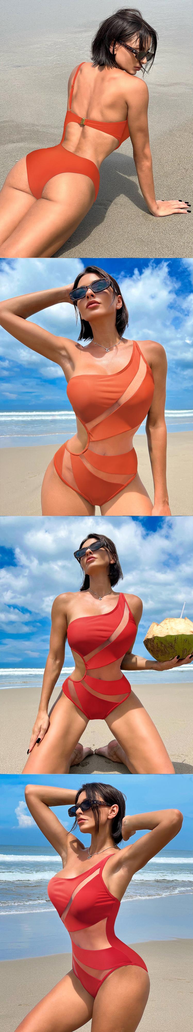 送料無料 セクシーなワンショルダーメッシュパッチワークワンピース水着女性 2023 中空アウトカット女性の水着モノキニプッシュアップビキニ AE1212332277011763392