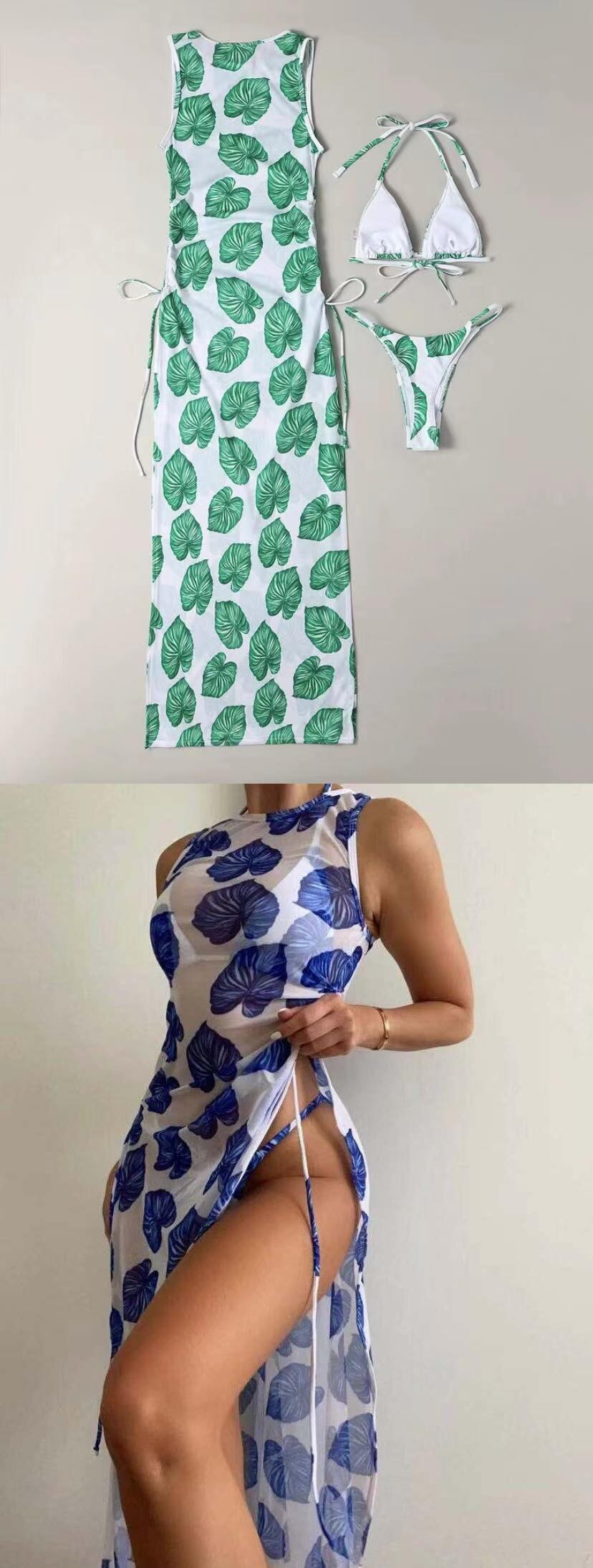 送料無料 3 個リーフプリント Tバックビキニ 2023 女性カバーアップ水着トリキニ水着海水浴者水着夏 サマー 夏物 AE1235655332299200971212