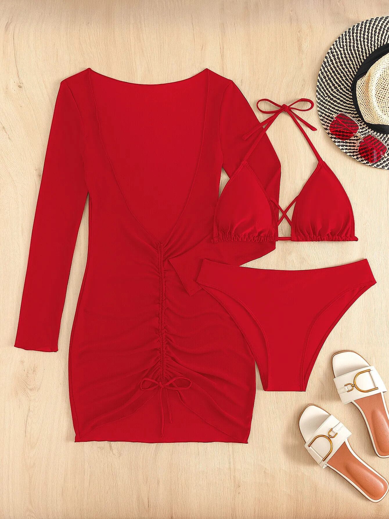 送料無料 3 ピース無地ホルター三角ビキニ 2023 女性 & カバーアップ水着水着ビーチウェア水着水着夏 サマー 夏物 AE1235655332233401274257
