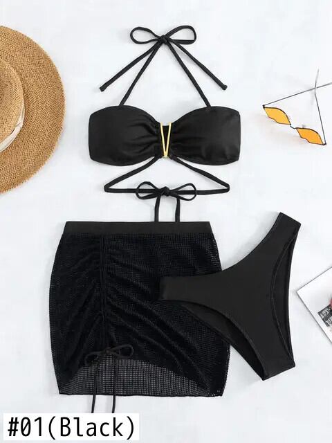 送料無料 3 個ブラック V ワイヤーホルタービキニ 2023 女性 & ビーチスカート水着水着ソリッドビーチウェア水着水着 ソリッドカラー AE1235655332282021347395
