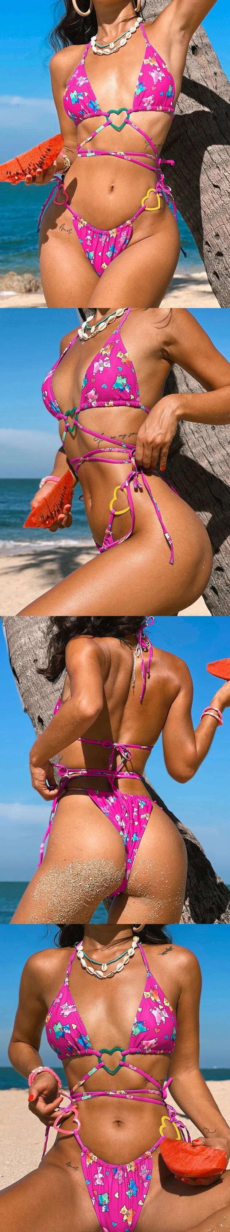 送料無料 漫画プリントカットアウトストリングトライアングルビキニ 2023 女性のセクシーな水着 Tバック水着水着ビーチウェア AE1235655332299133074836