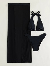 送料無料 3 個ブラックホルタービキニ 2023 水着女性 & カバーアップスカート固体水着ビーチウェア海水浴水着 ソリッドカラー AE1235655332283071120642