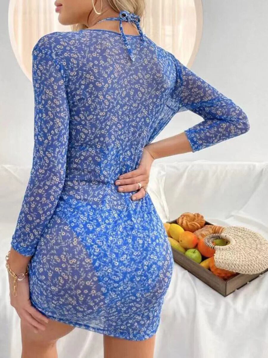送料無料 ホルター三角ビキニ 2023 レディース & 巾着カバーアップ花柄水着ブルー水着ビーチウェア水着水着 AE1235655332243621891415