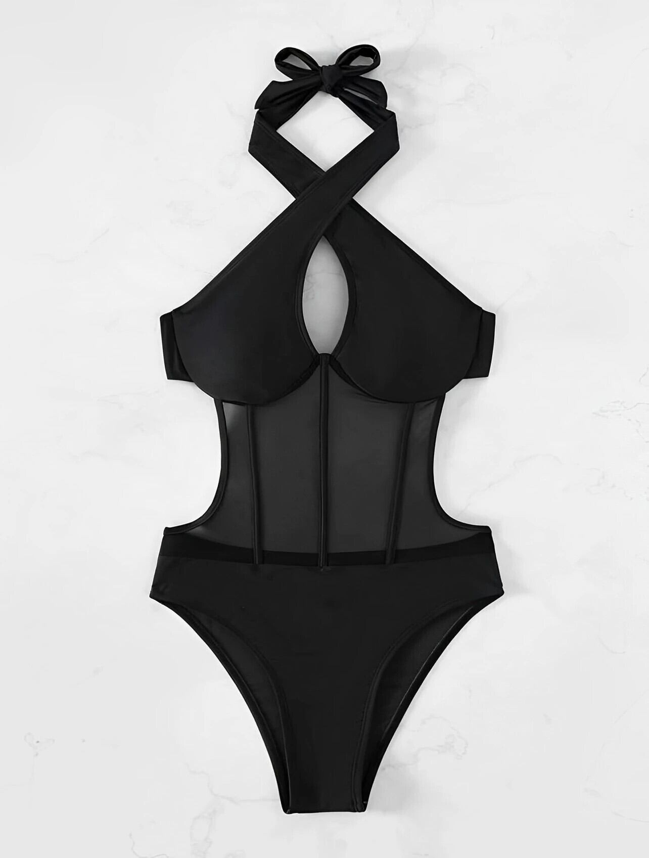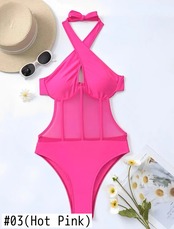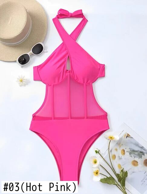 送料無料 2023 コントラストメッシュカットアウトホルター水着ワンピース固体水着女性プッシュアップ水着水泳水着ビーチウェア ソリッドカラー AE123565533227713363983