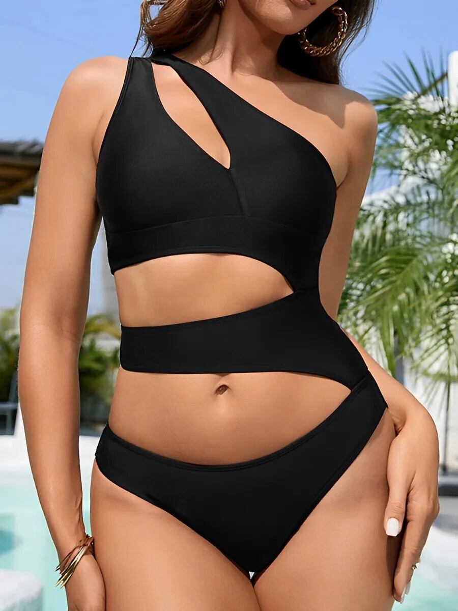 送料無料 2023 黒水着ワンピースソリッドカットアウト水着女性のセクシーな海水浴水泳水着ビーチウェア ブラック ソリッドカラー AE1235655332294939965358