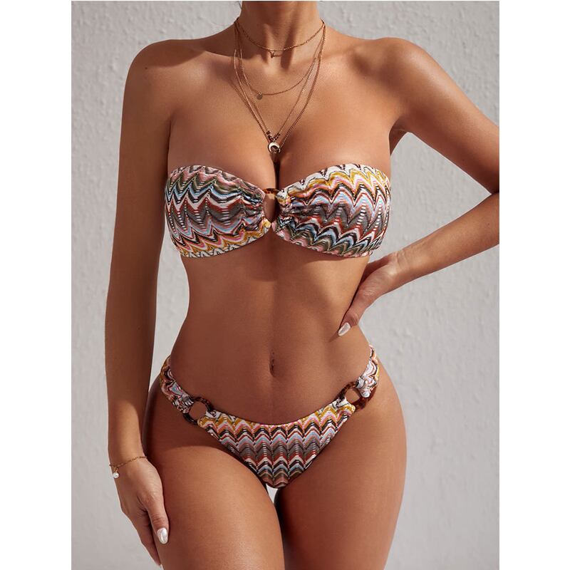 送料無料 2023 ストライププリントツーピース水着女性のセクシーなストラップレスバンドゥ背中の開いたビーチビキニローウエスト水着水着 AE33232335585197287111