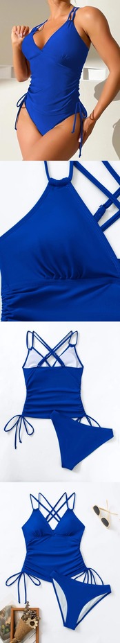 送料無料 ソリッドカラー水着女性 2023 ウエストタンキニ V ネック 2 ピースサスペンダービキニ水着レースアップ背中の開いたビーチ水着 Vネック AE33232335570727198138