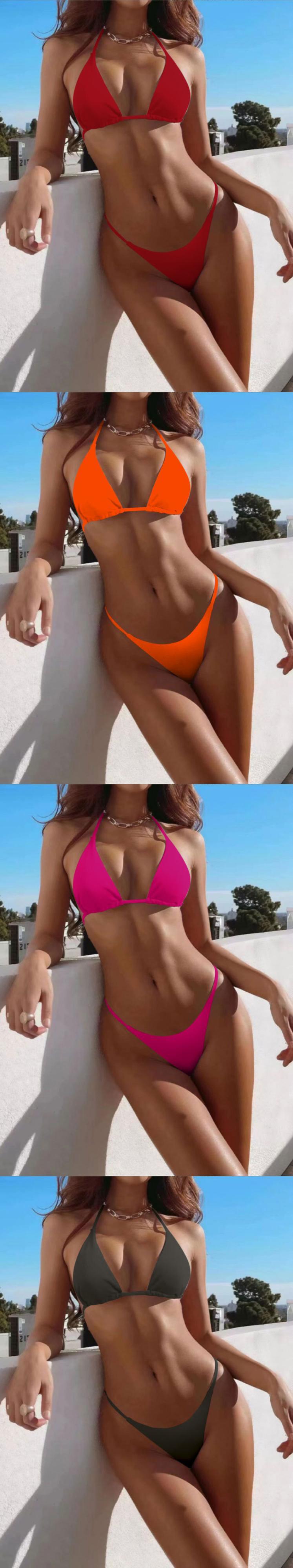 送料無料 ソリッドカラー 2 ピース水着女性 2023 夏スプリットビキニセクシーな三角形カップホルター背中の開いたローウエスト Tバックビーチ水着 サマー 夏物 AE33232335572730193142