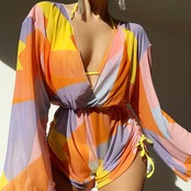 送料無料 4 ピースシフォン水着コントラストカラープリントビキニ女性 2023 日焼け止めカバーアップ水着ボクサーブリーフ水着 OLDL030 AE33232335538180111645